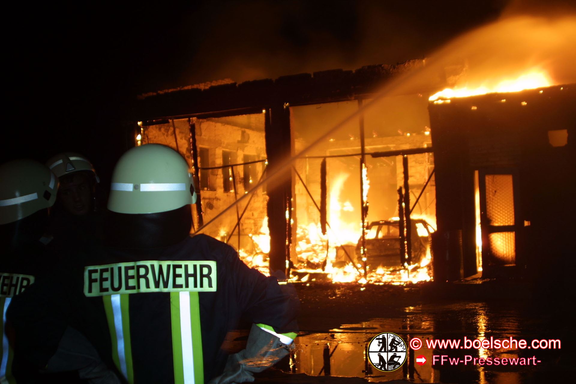 Unter Atemschutz agieren die Einsatzkräfte. Immer wieder knallt es zwischendurch. Zum einen ist es das Wellasbest des Daches und zum anderen wurden Propangasflaschen gelagert. Eine nicht ungefährliche Arbeit der Kameraden.