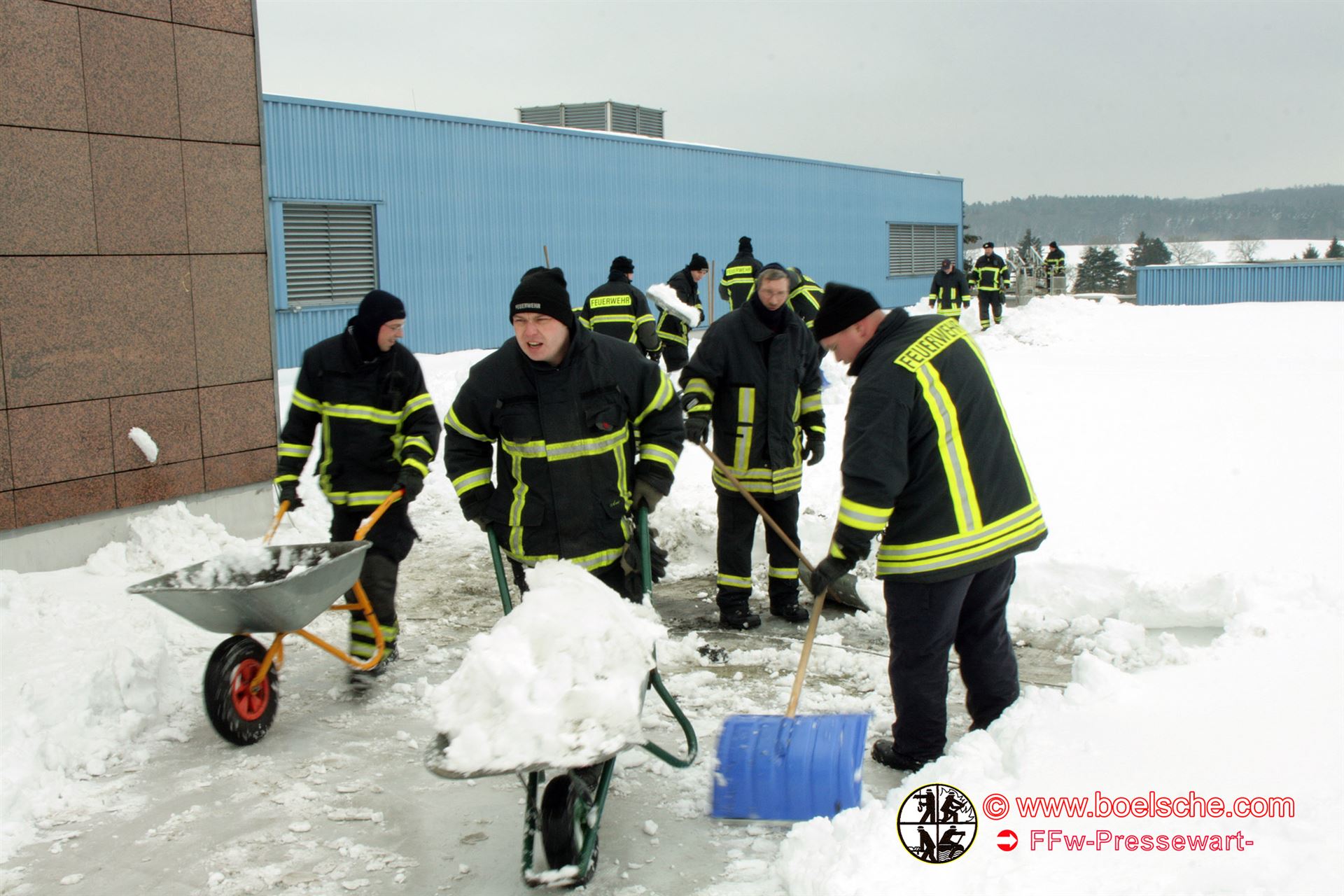 So rückten 20 Kameraden mit Schaufel, Schneeschieber und Schubkarren an. Mittels der Drehleiter ging es den direkten Weg aufs Dach, welches immerhin eine Fläche von etwa 7500 Quadratmetern besitzt.